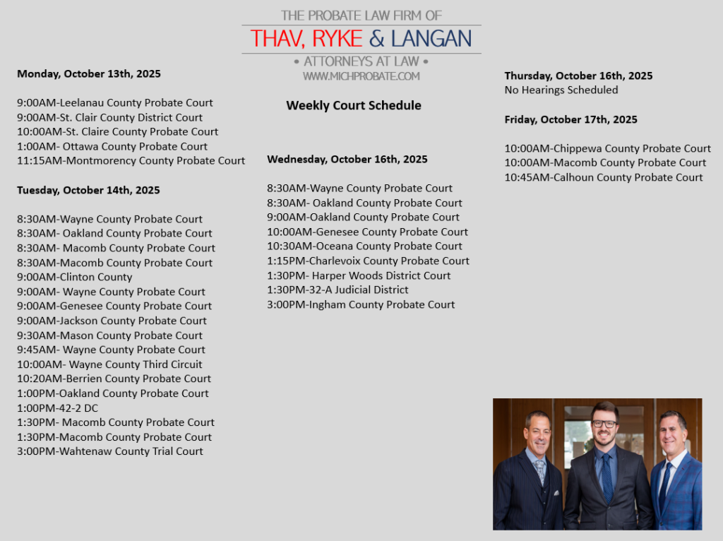 We are probate lawyers available to you throughout the entire State of Michigan. Each week, probate attorneys from the Probate Law Firm of Thav, Ryke & Associates in Southfield, Michigan are present in local Michigan area probate courts. Here is our schedule for this week: